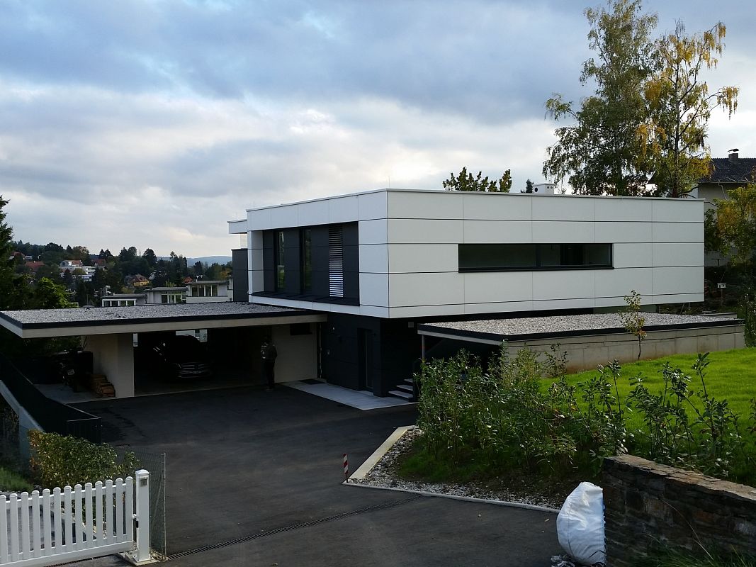 Neubau eines Doppelwohnhauses in Holzbauweise mit Kompaktplattenfassade.Wärmepumpe mit solarbeheizter Speichermasse unter dem Gebäude.